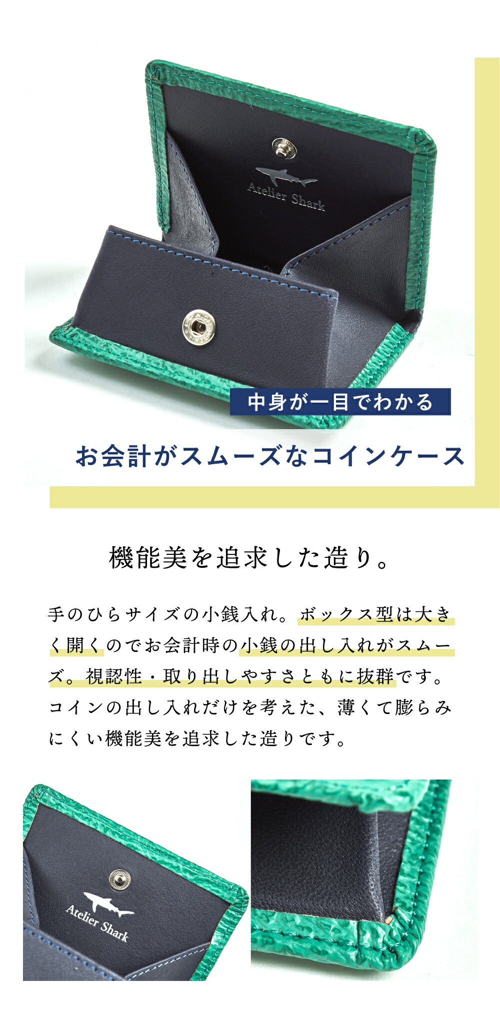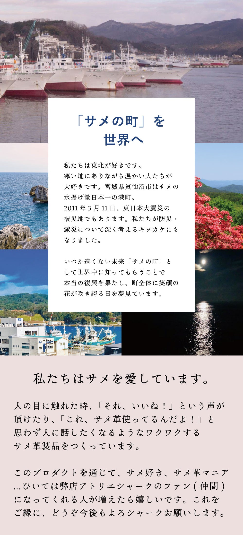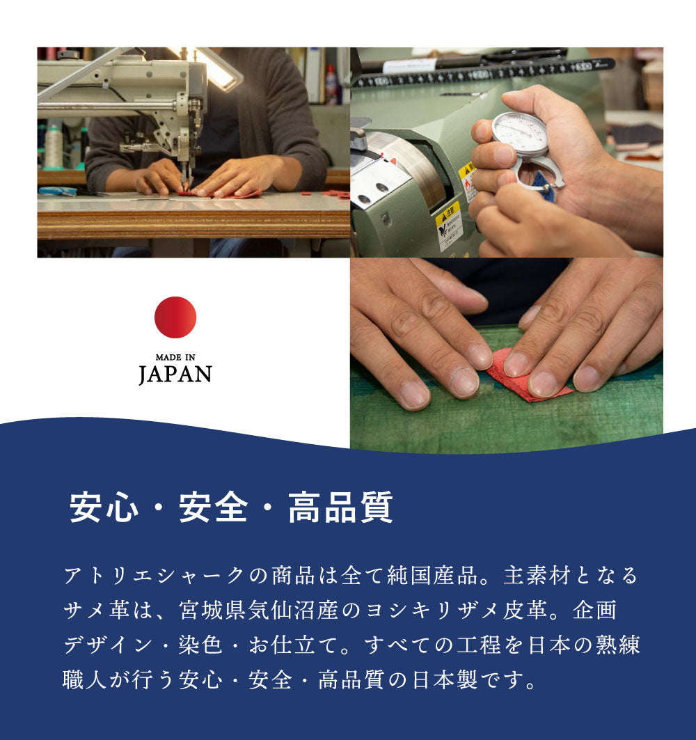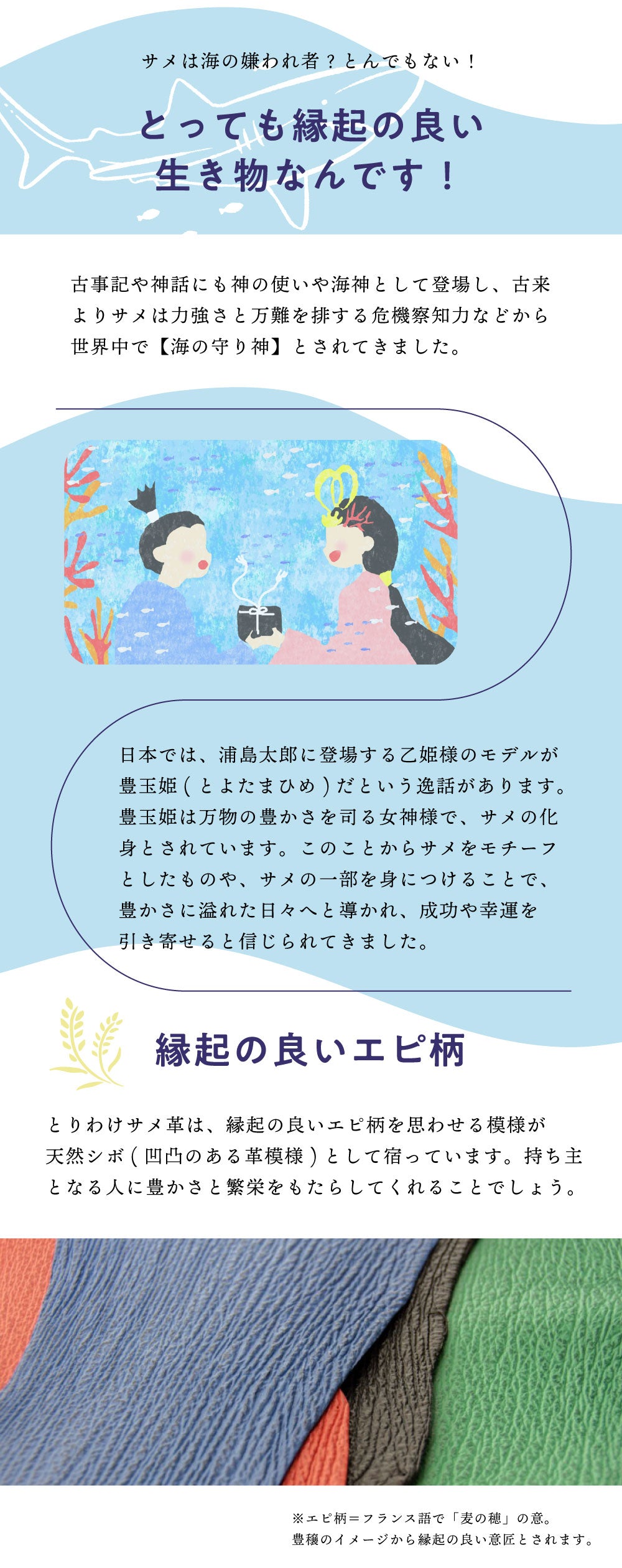 | お取り扱い | ・厳選された天然サメ皮革を用い、染色加工を施し製造されていますが、性質上色落ち、水染みができる可能性がございます。水分が付着した場合は、乾いた柔らかい布でお拭き取りください。 |