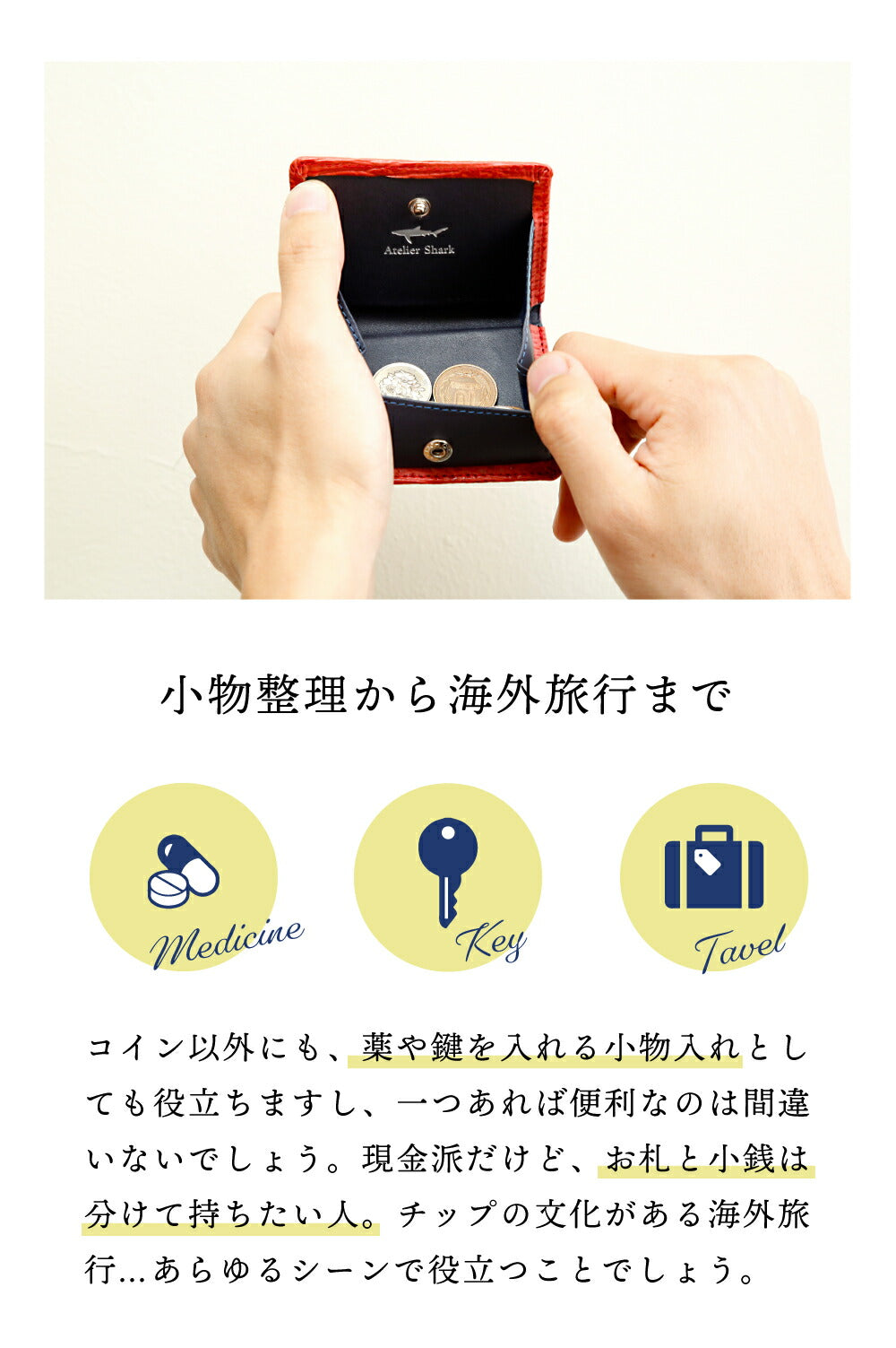 | 注意事項 | ・天然皮革には、動物が元々持っているシワ・ムラ・傷等がございます。それが革の特性であり、風合い・味わいですので、その旨ご了承くださいませ。 ・サメ革には、表面に針で刺したような小さな穴がある場合がございます。こちらはサメの胴体脇にある、側線と呼ばれる感覚器官で、穴の大きさや間隔に個体差はありますが、全ての個体に備わっているサメ革の特性となります。 ・商品写真は、できるだけ実物の色味に近づけるよう撮影・加工しておりますが、革の個体差やお客様がご使用のモニター・閲覧環境により商品の色味が異なる場合がございます。 |