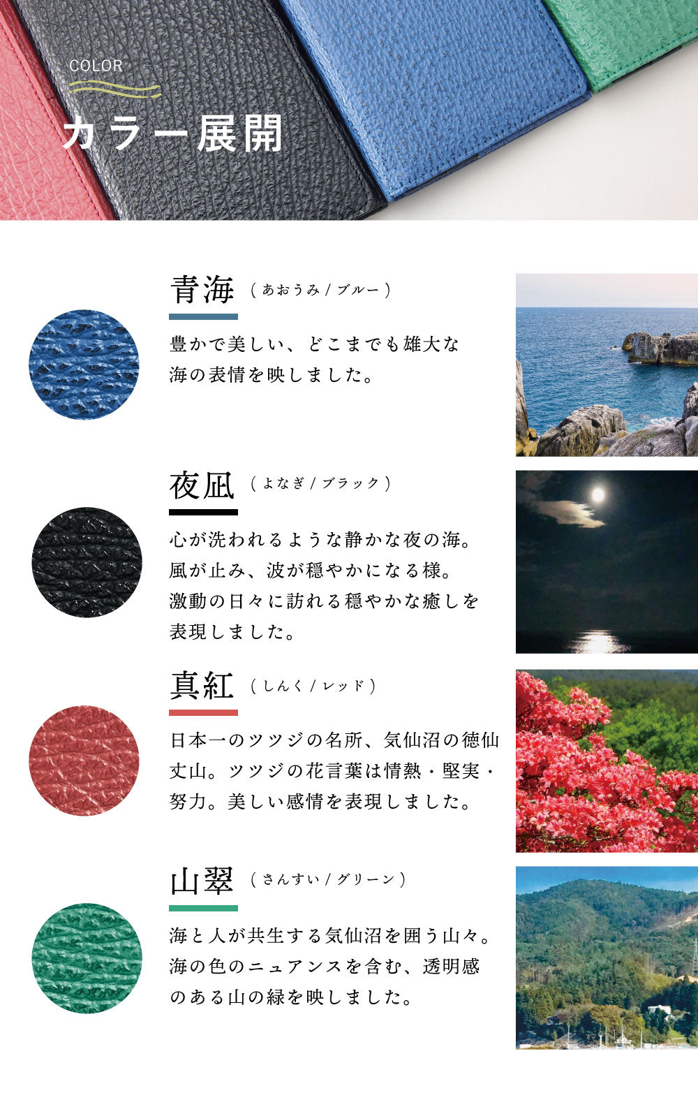 | カラー | 青海 (あおうみ/ブルー) / 豊かで美しい、どこまでも雄大な海の表情を映しました。 夜凪 (よなぎ/ブラック) / 心が洗われるような静かな夜の海。風が止み、波が穏やかになる様。激動の日々に訪れる穏やかな癒しを表現しました。 深紅 (しんく/レッド) / 日本一のツツジの名所、気仙沼の徳仙 丈山。ツツジの花言葉は情熱・堅実・ 努力。美しい感情を表現しました。 山翠 (さんすい/グリーン) / 海と人が共生する気仙沼を囲う山々。 海の色のニュアンスを含む、透明感 のある山の緑を映しました。 |